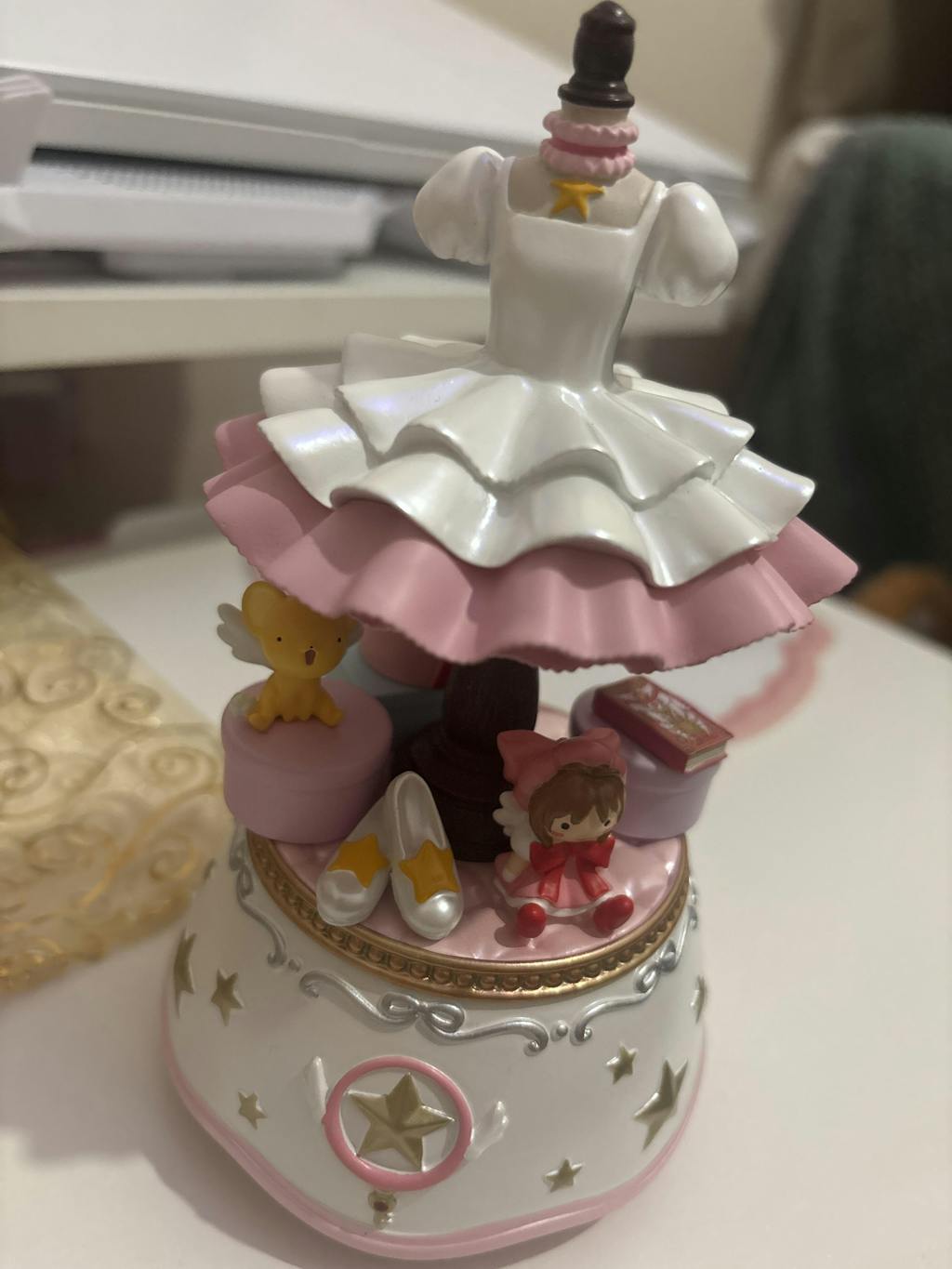 the stuffed animal that Sakura keeps on her bed . The costume and base are painted with pearlescent paint, and the ribbons and stars on the side of the base are painted with metallic paint for a sparkling, elegant shine. The gentle sound is soothing.